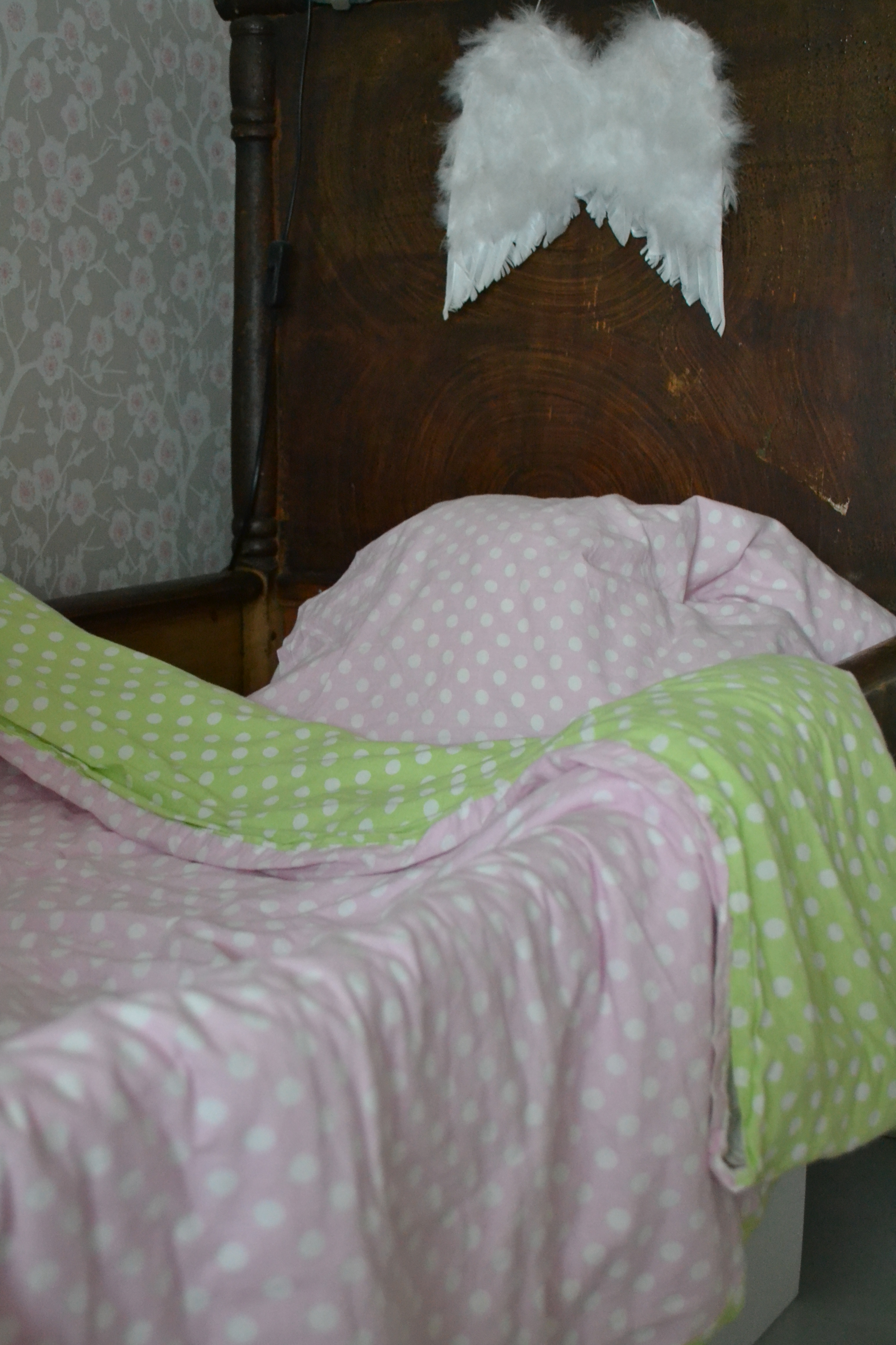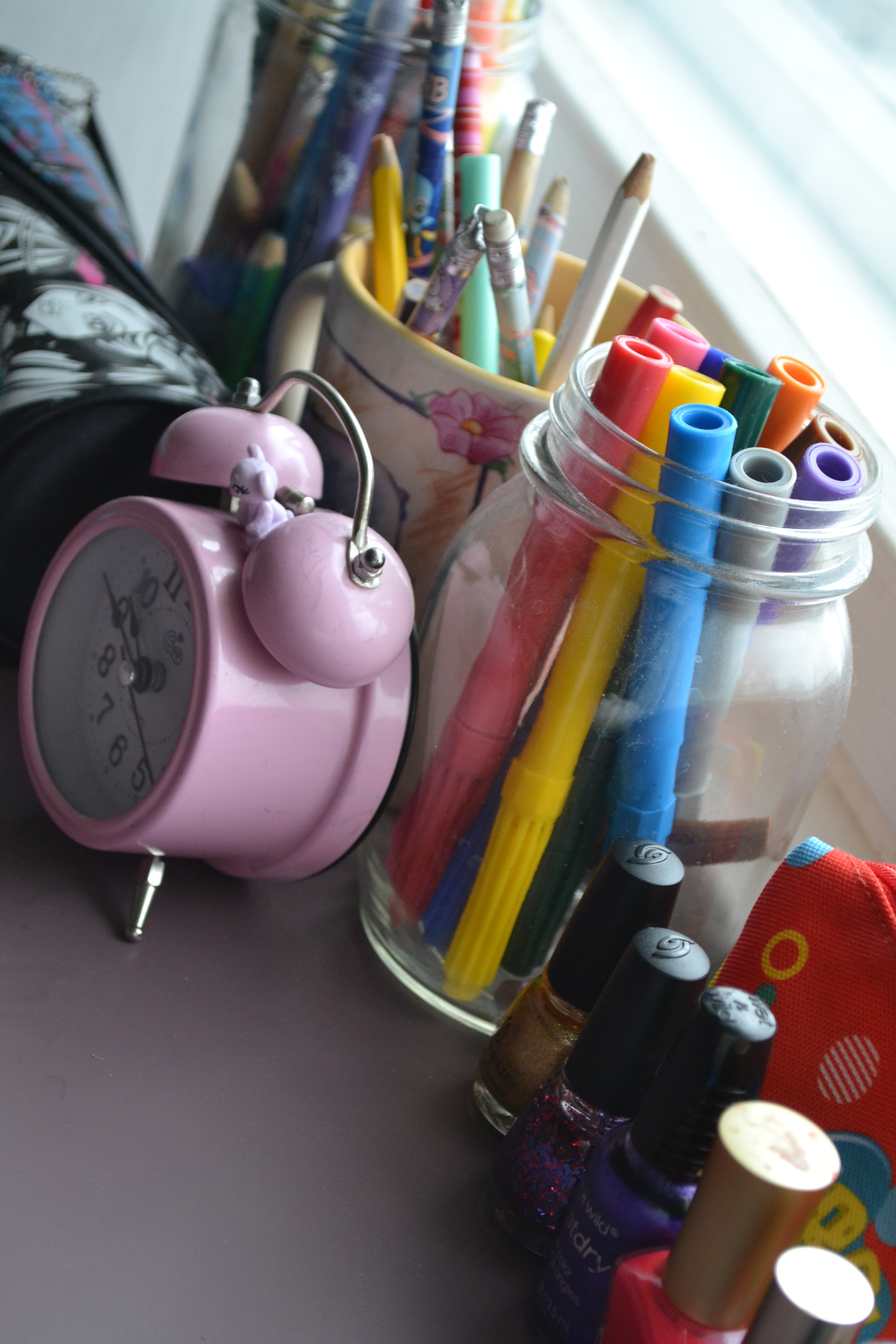 Ja hienohan se on! Sänky on hienosti itse pedattu, pikkulelut rivissä, kynät ojennuksessa ja pupulamppukin kuminauhoin koristeltu.
